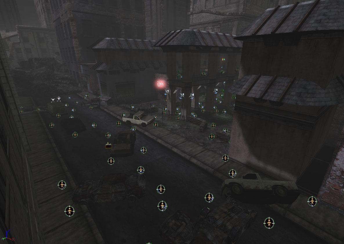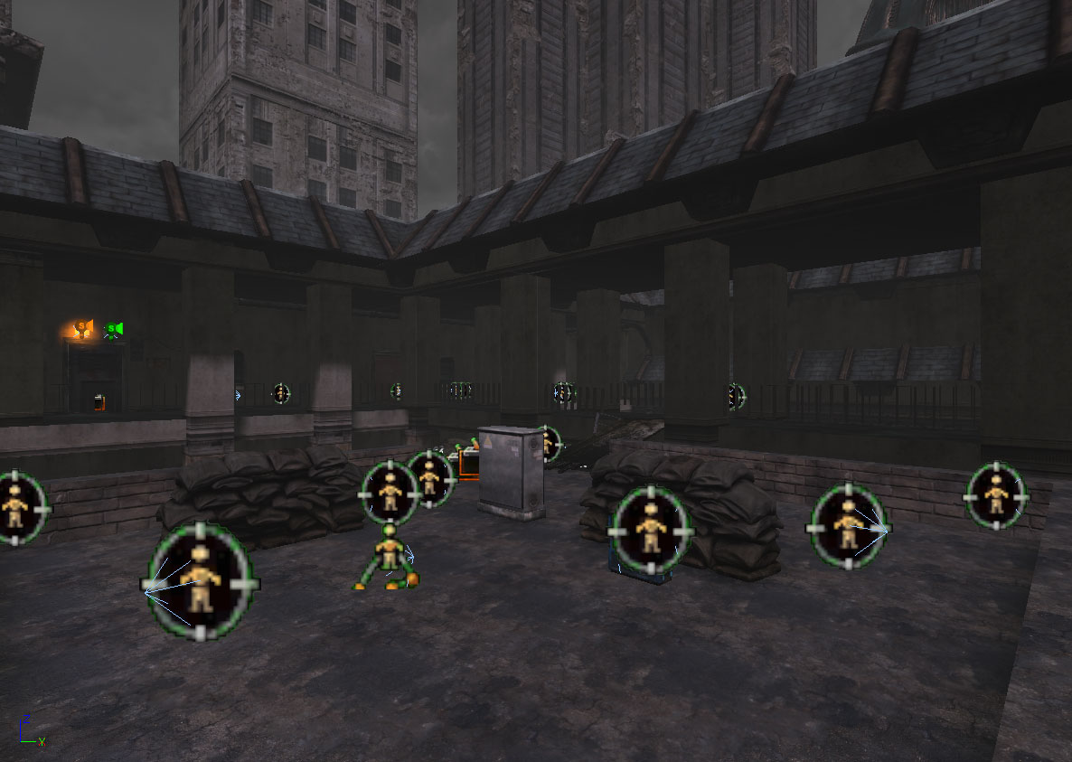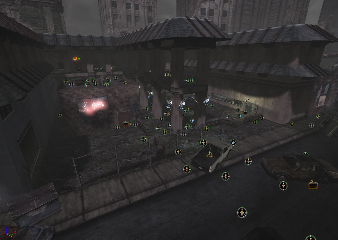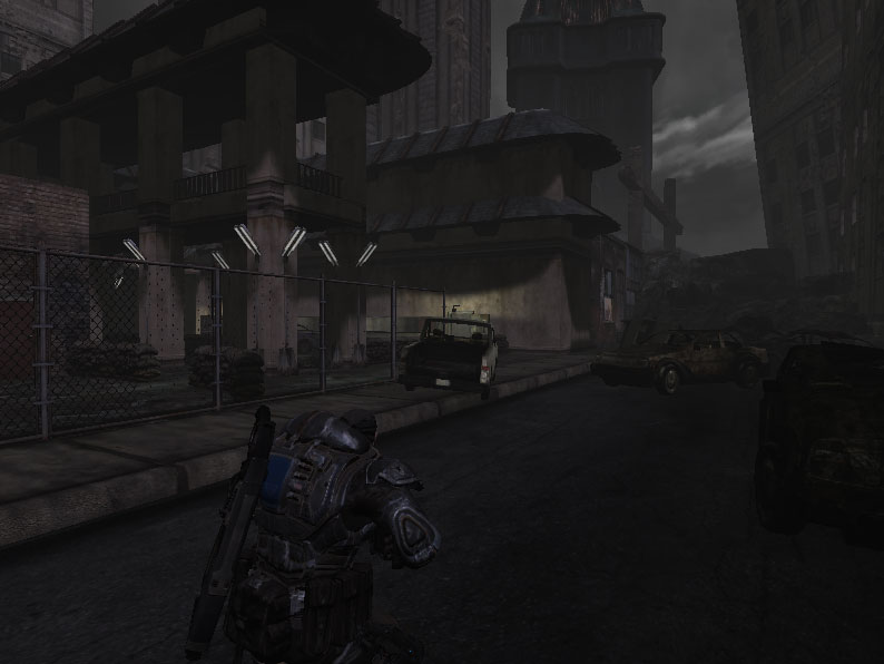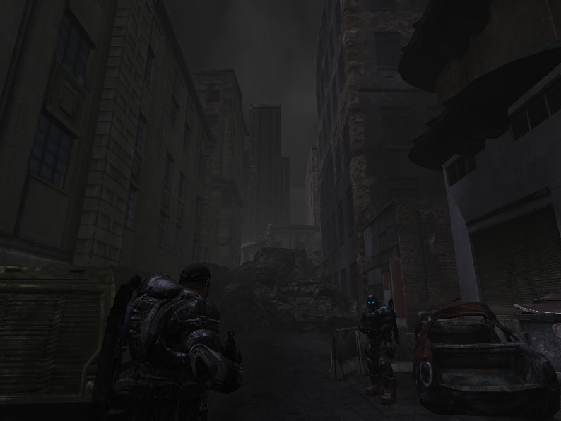 Basement Warehouse was a mixture of puzzles that the player had to solve in order to continue on. The player would start in the street outside of a fenced off building where they needed to fight until they made it inside the fence and decided to which way to proceed. If they went straight for the ladder that lead upstairs they would find a locked door. If they went inside on the first floor they would find a switch that would unlock the door. Once unlocked, the door would lead to an elevator shaft which would take the player straight down into the basement level. Once entering the basement the player has to navigate a unique climbing puzzle in which they must mount against and climb onto higher boxes. I was rather proud of this idea for a maze like climbing puzzle given that it was not something seen in Gears of War before, as the game lacks a jump button at all.